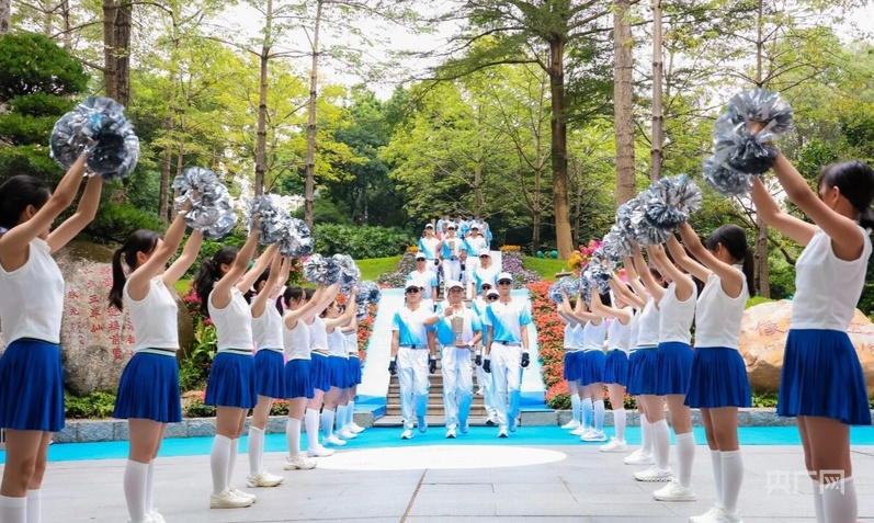 在五羊石像广场,本届赛会的吉祥物“喜洋洋”与“乐融融”,与火炬手进行一场跨越次元的接力,活力四射的啦啦操与古老的五羊传说奇妙交融。