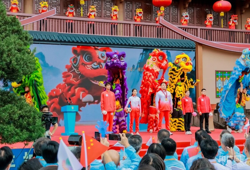在五羊石像广场,本届赛会的吉祥物“喜洋洋”与“乐融融”,与火炬手进行一场跨越次元的接力,活力四射的啦啦操与古老的五羊传说奇妙交融。
